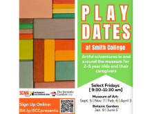 Registered families can join us in the Atrium of the Smith College Museum of Art for open play and art experiences from 9:30–11:30am. Upon arrival, sign up for a museum tour slot for 9:45, 10:15, or 10:45 am. Museum educator Gina Hall will lead these interactive experiences in the galleries for up to ten children and their caregivers. Families can connect, play, and create in the Atrium with NPS early childhood educator, Ashley Miller, when not in the museum. Please feel free to join us anytime between 9:30–11:30 am.