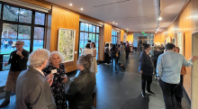 top: Museum Visiting Committee (MVC) members and SCMA staff celebrate the opening of MVC member Jane Timken's exhibition Jane Timken: Rooftops & Roses in October 2025. Photo by Martha Ebner????